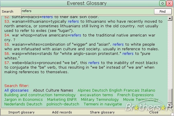 The translation utility bundles 37 different dictionaries that cover all major European languages. With Everest Dictionary with databases, you can store dictionaries in separate databases, choose from five different translation sets, even choose what filters should be applied to the selected source language. You can import words and phrases from any text file into the translation dictionaries, so you can add a native language or a foreign source any time you want to.